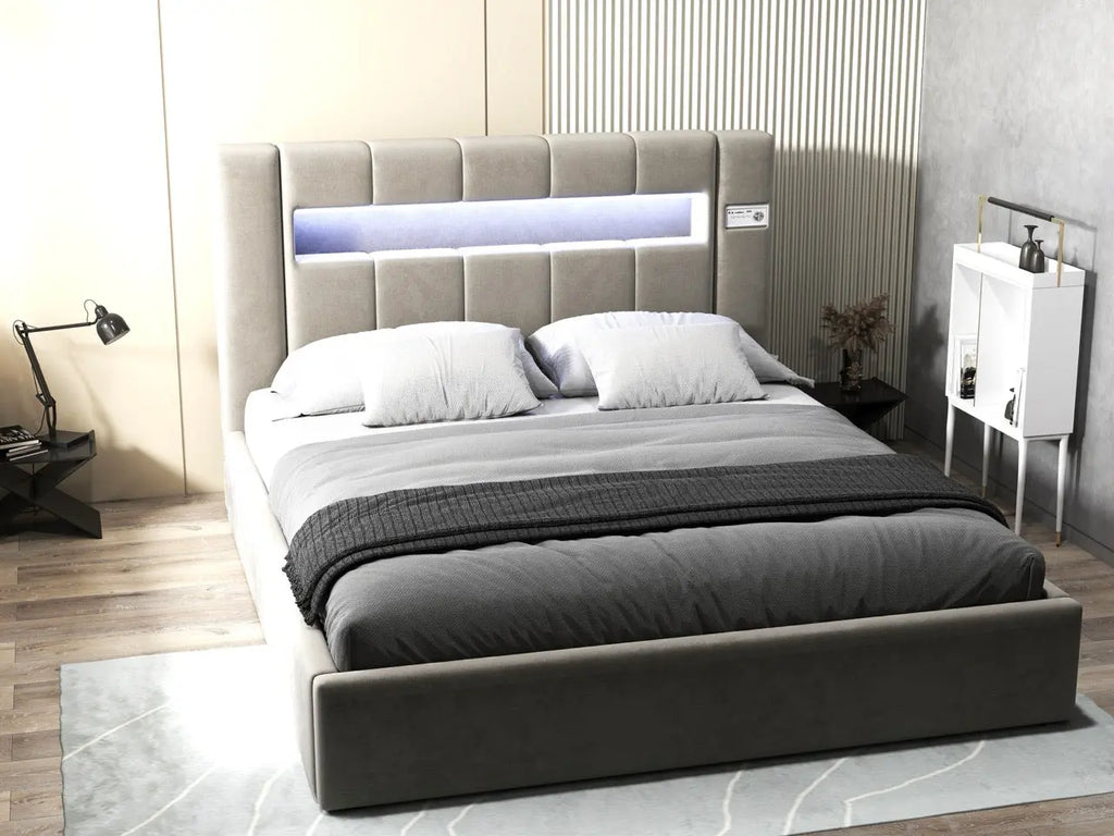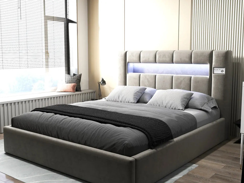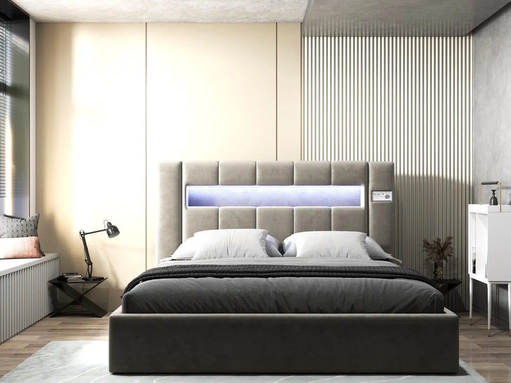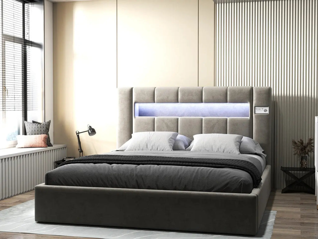 Pat dormitor dumonde, tapitat bej, Glow 180x200 cm, somiera rabatabila inclusa, spatiu depozitare WLS